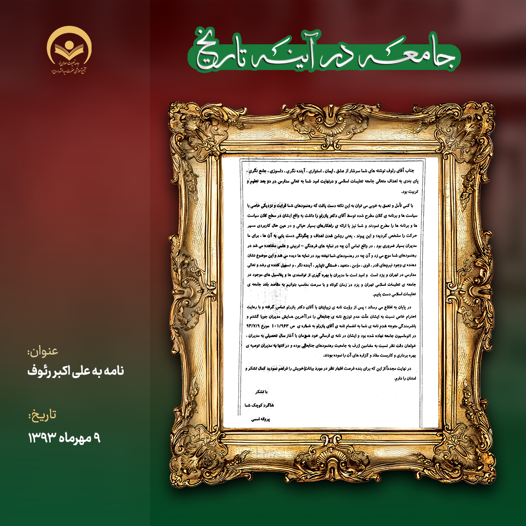 تقدیر از علی اکبر رئوف به واسطه برگزاری مجلس ترحیم بنیانگذارجامعه تعلیمات اسلامی
